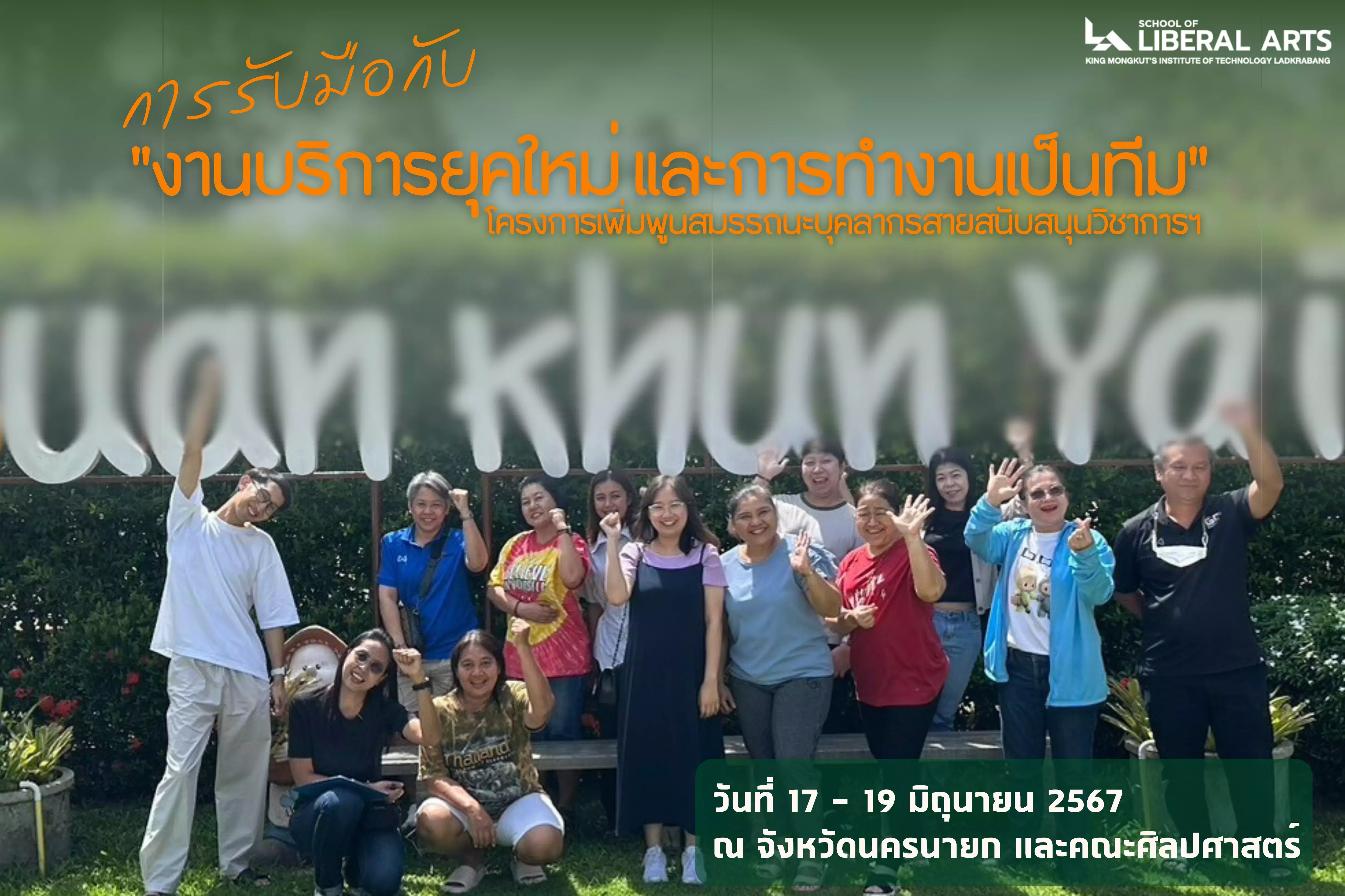 🦚คณะศิลปศาสตร์ สจล. จัดโครงการ การพัฒนาศักยภาพสมรรถะบุคลากรเพื่อผลักดันสู่ความเป็นเลิศ: คิดบวก คิดสร้างสรรค์ ทำงานอย่างมีความสุข เราสร้างได้ ภายใต้หัวข้อ "การรับมือกับงานบริการยุคใหม่ และการทำงานเป็นทีม" ให้กับสายสนับสนุนวิชาการฯ เมื่อวันที่ 17 – 19 มิถุนายน 2567ณ จังหวัดนครนายก และคณะศิลปศาสตร์