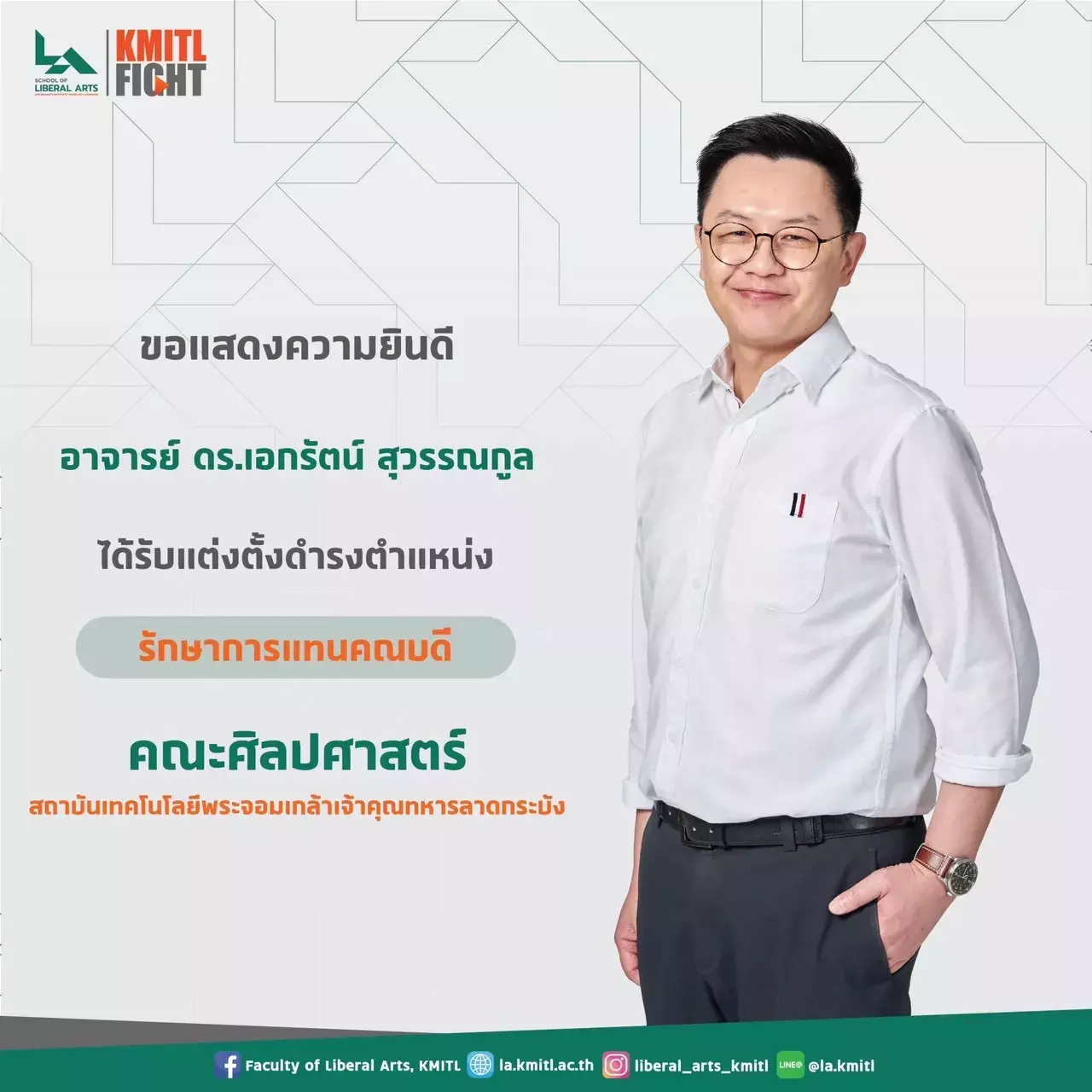 Image คณะศิลปศาสตร์ ขอแสดงความยินดีกับ อาจารย์ ดร.เอกรัตน์ สุวรรณกูล เนื่องในโอกาสที่ได้รับการแต่งตั้งให้ดำรงตำแหน่ง รักษาการแทนคณบดี คณะศิลปศาสตร์ สถาบันเทคโนโลยีพระจอมเกล้าเจ้าคุณทหารลาดกระบัง ข่าวประชาสัมพันธ์