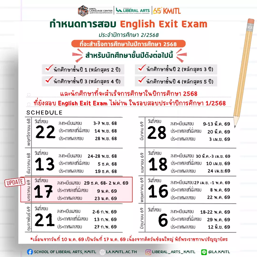 และนักศึกษาที่จะสำเร็จการศึกษาในปีการศึกษา 2567 ที่ยังสอบ English Exit Exam ไม่ผ่าน ในรอบสอบประจำปีการศึกษา 1/2568
