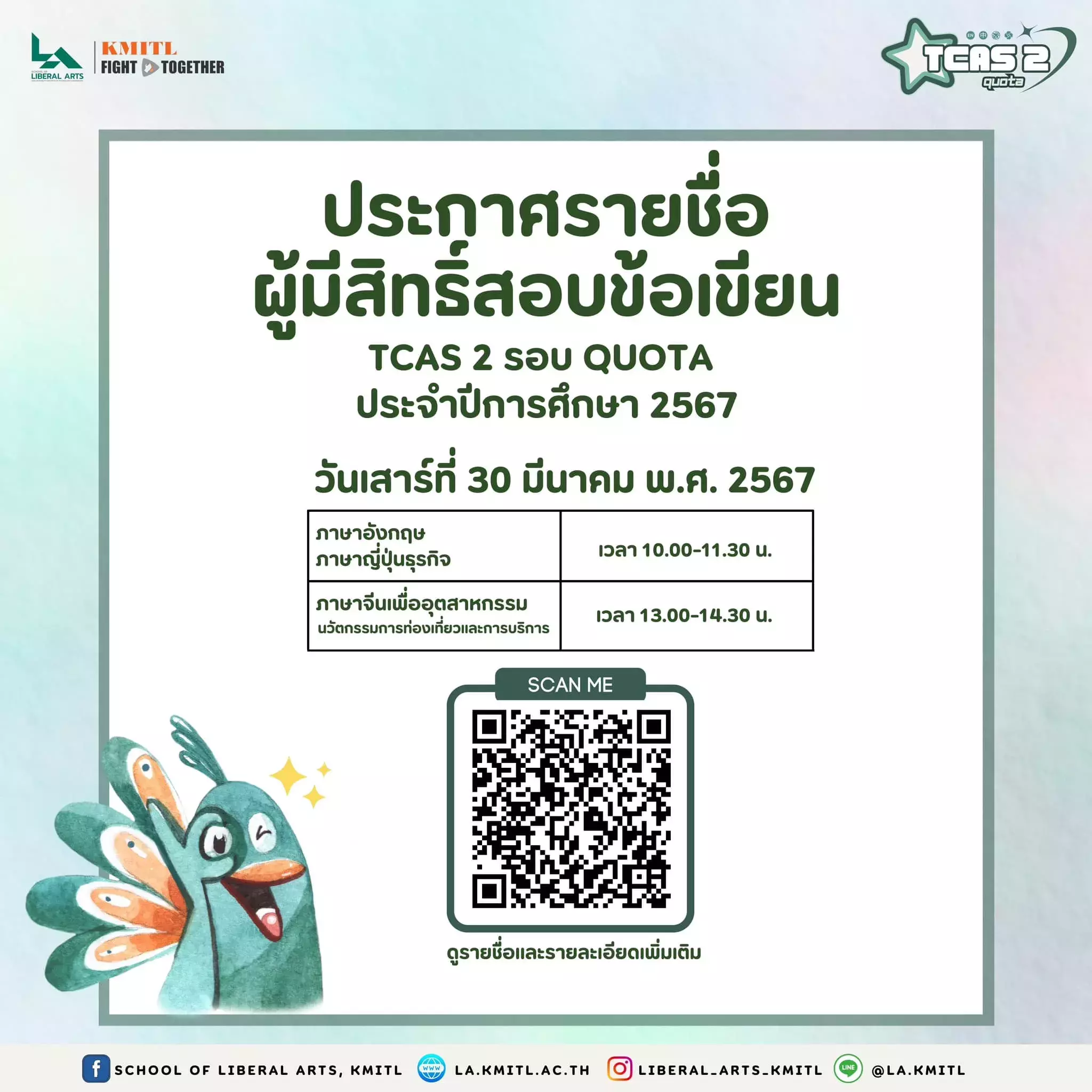 ประกาศรายชื่อผู้มีสิทธิ์สอบข้อเขียน TCAS 2 รอบ Quota คณะศิลปศาสตร์ ประจำปีการศึกษา 2567