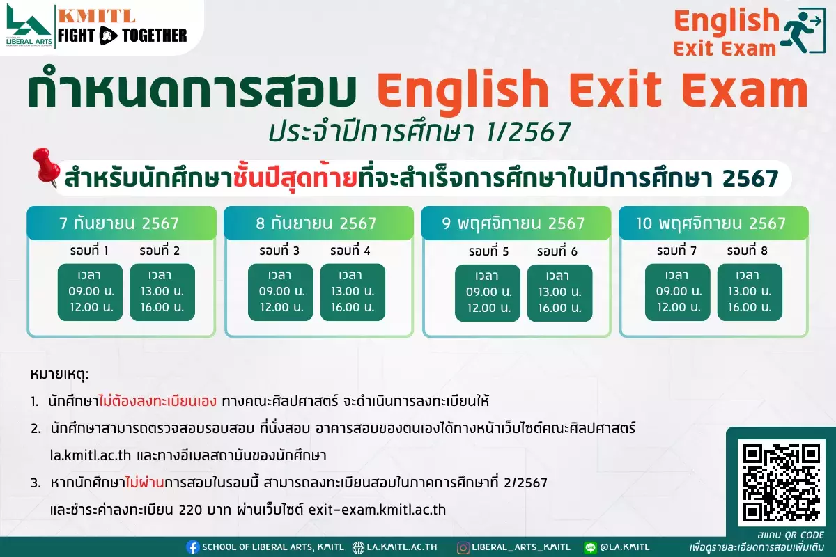 และนักศึกษาที่จะสำเร็จการศึกษาในปีการศึกษา 2567 ที่ยังสอบ English Exit Exam ไม่ผ่าน ในรอบสอบประจำปีการศึกษา 1/2567